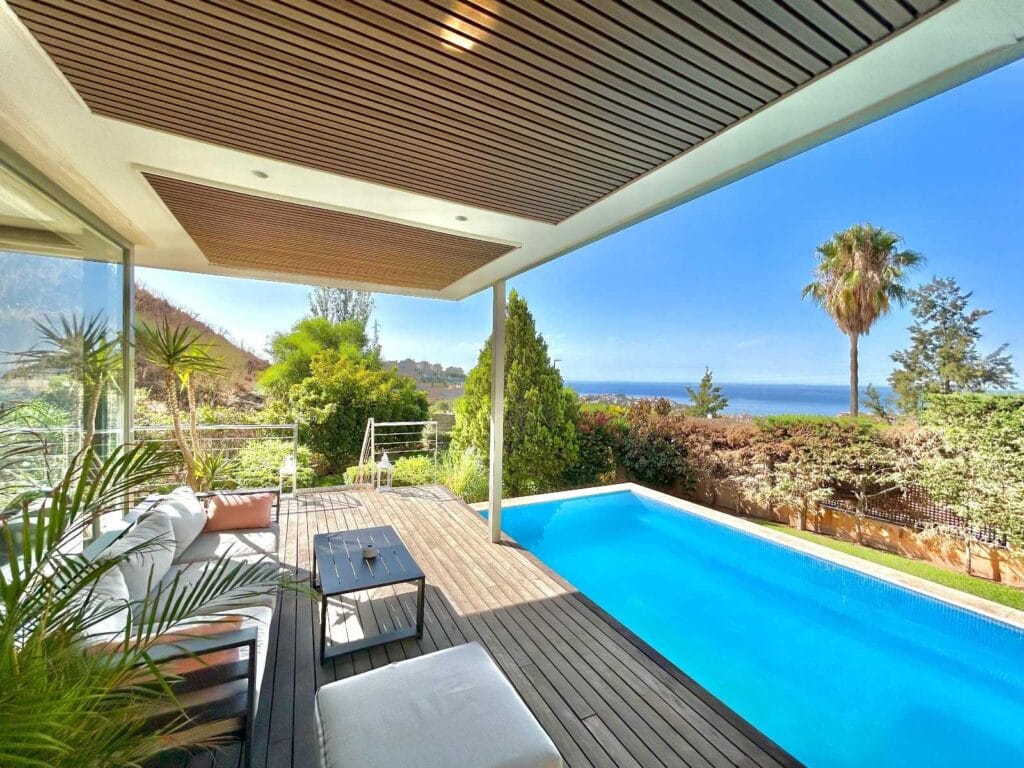 Elegante casa reformada en 2022 con 223 m² en parcela de 317 m², 3 dormitorios y 3 baños. Piscina privada, vistas mar y montaña, placas solares, garaje. Playa y servicios próximos.