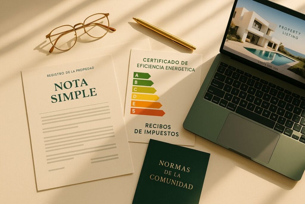 The “nota simple registral” is the first document you need. It confirms who the legal owner is and whether the property carries debts such as mortgages, liens, or usufruct rights. Without it, you risk buying a home with someone else’s debts.