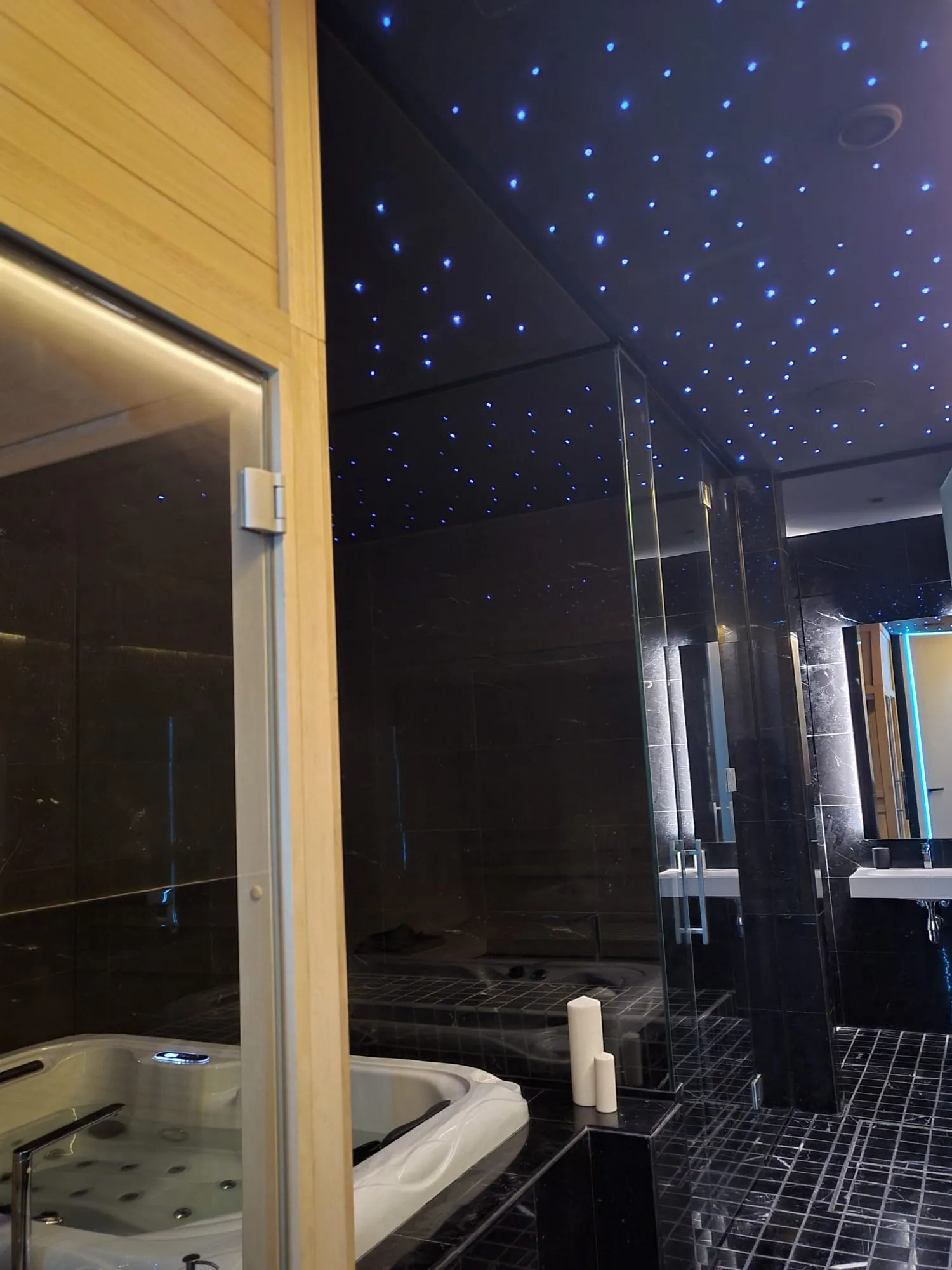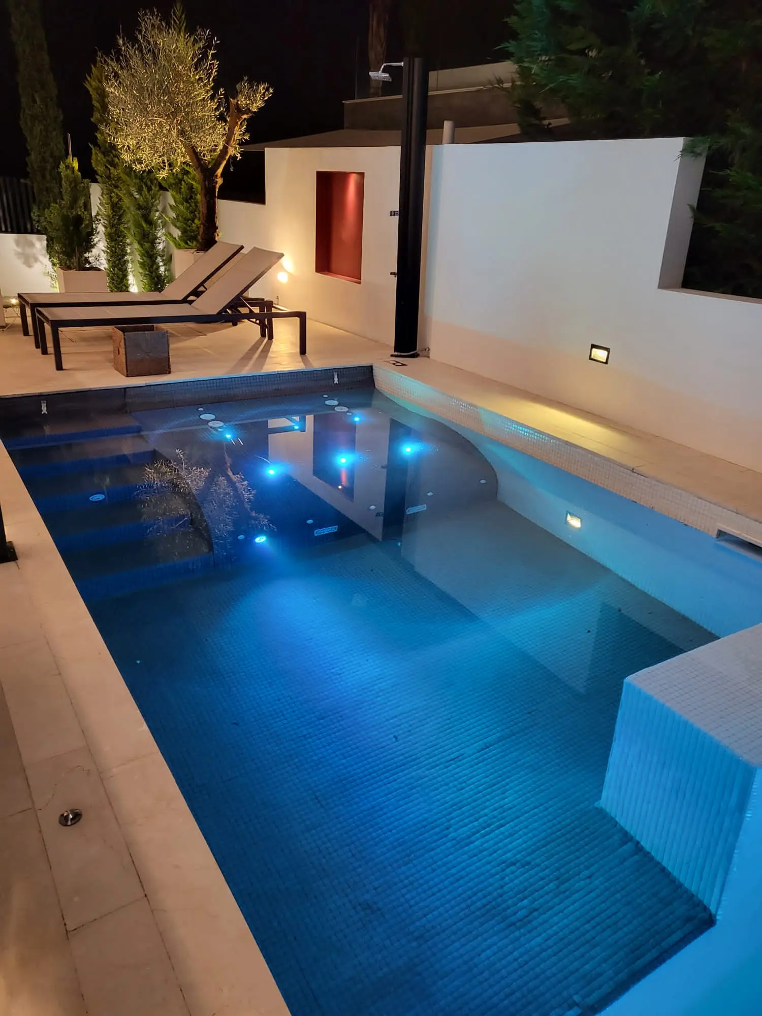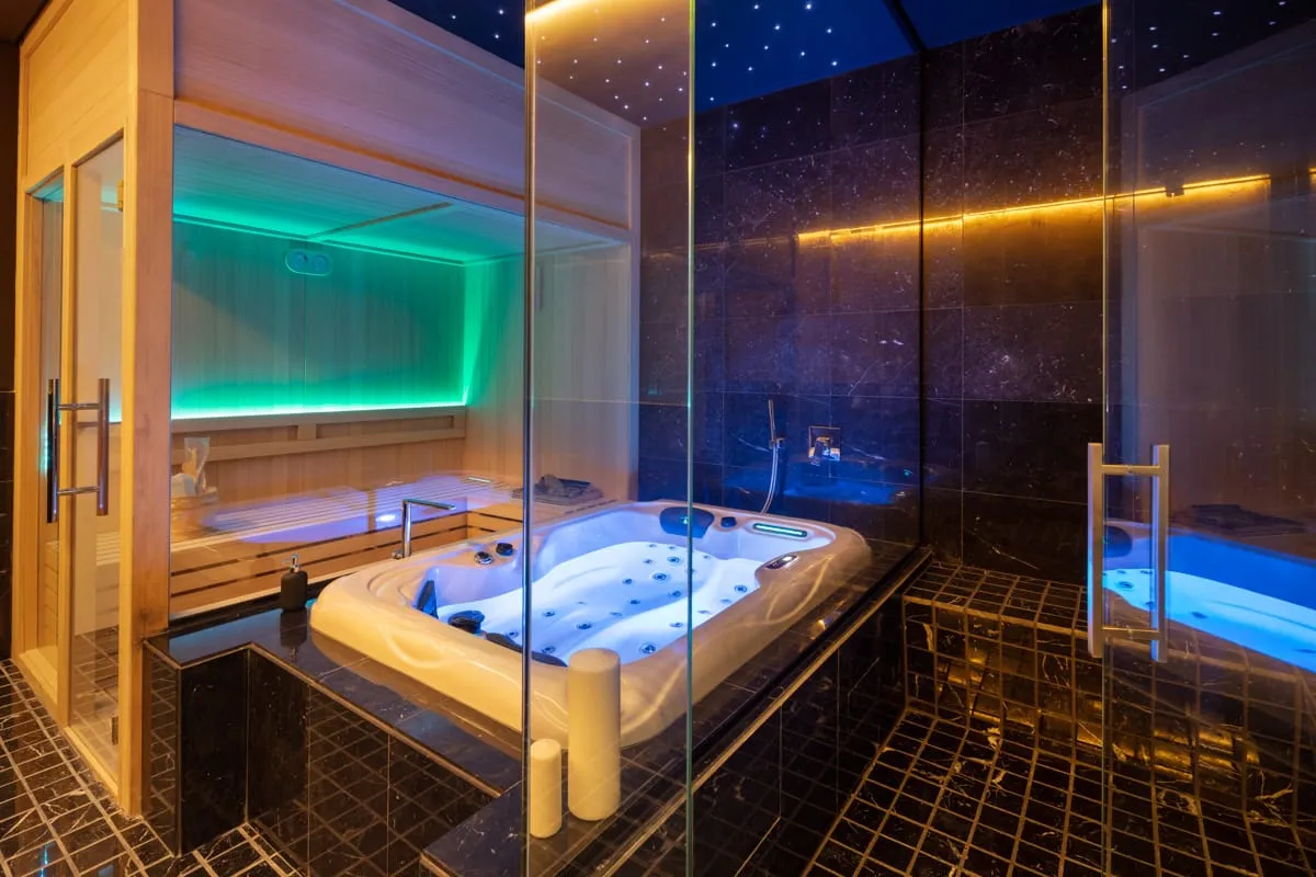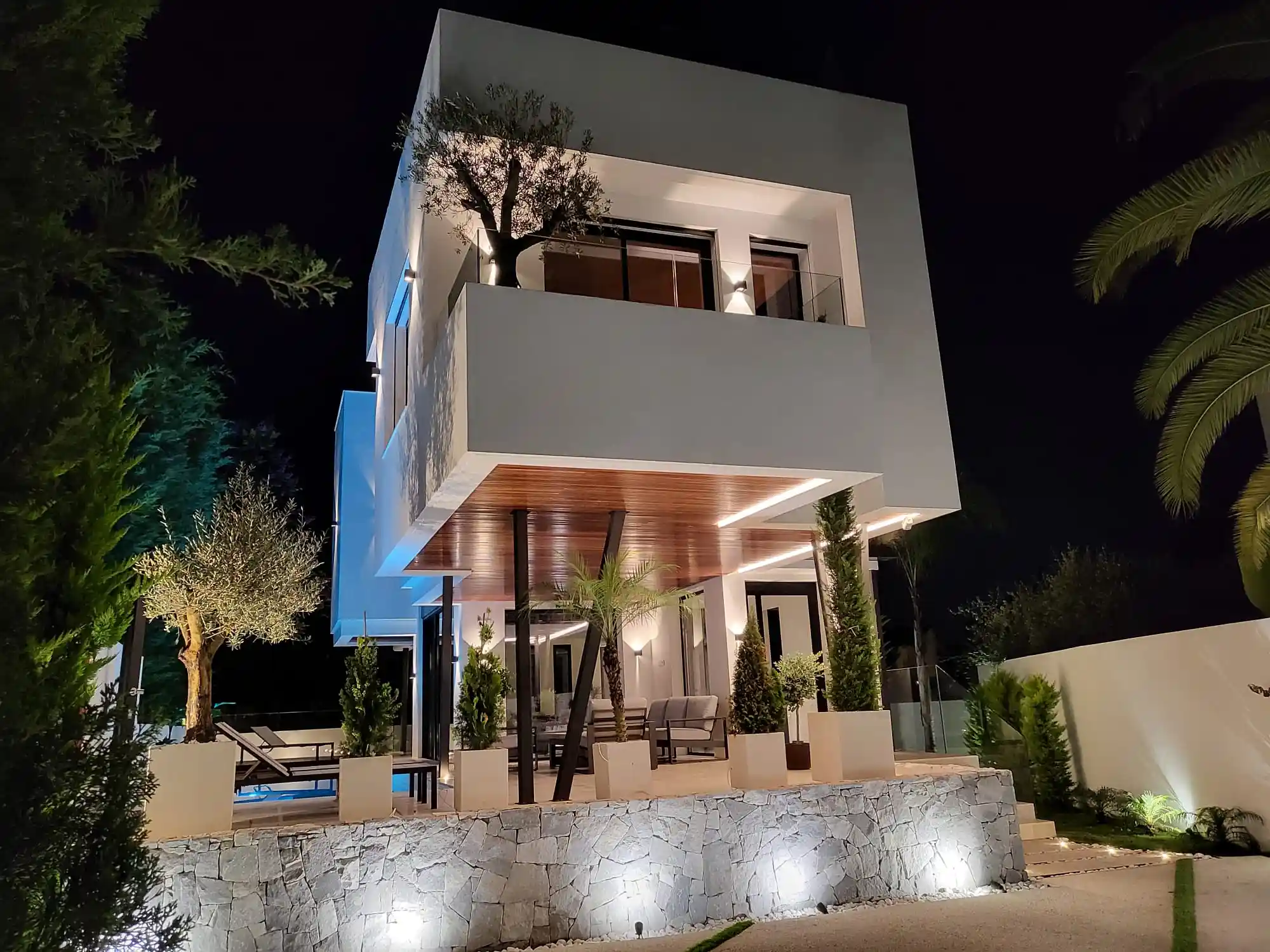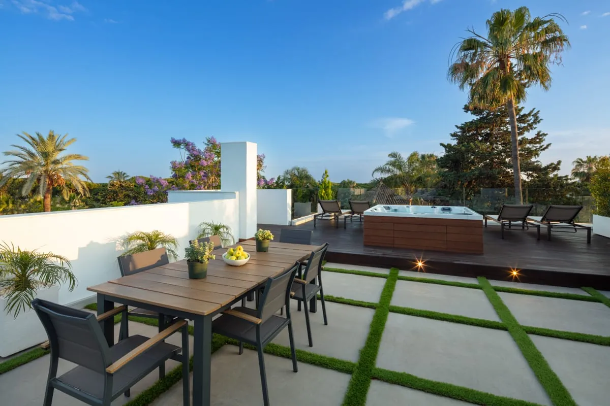 The property offers five bedrooms and seven bathrooms, with a wellness area on the lower level including a spa, Finnish sauna and jacuzzi. Outdoor spaces include a rooftop terrace with chill-out area, barbecue, solarium and jacuzzi with stunning views.