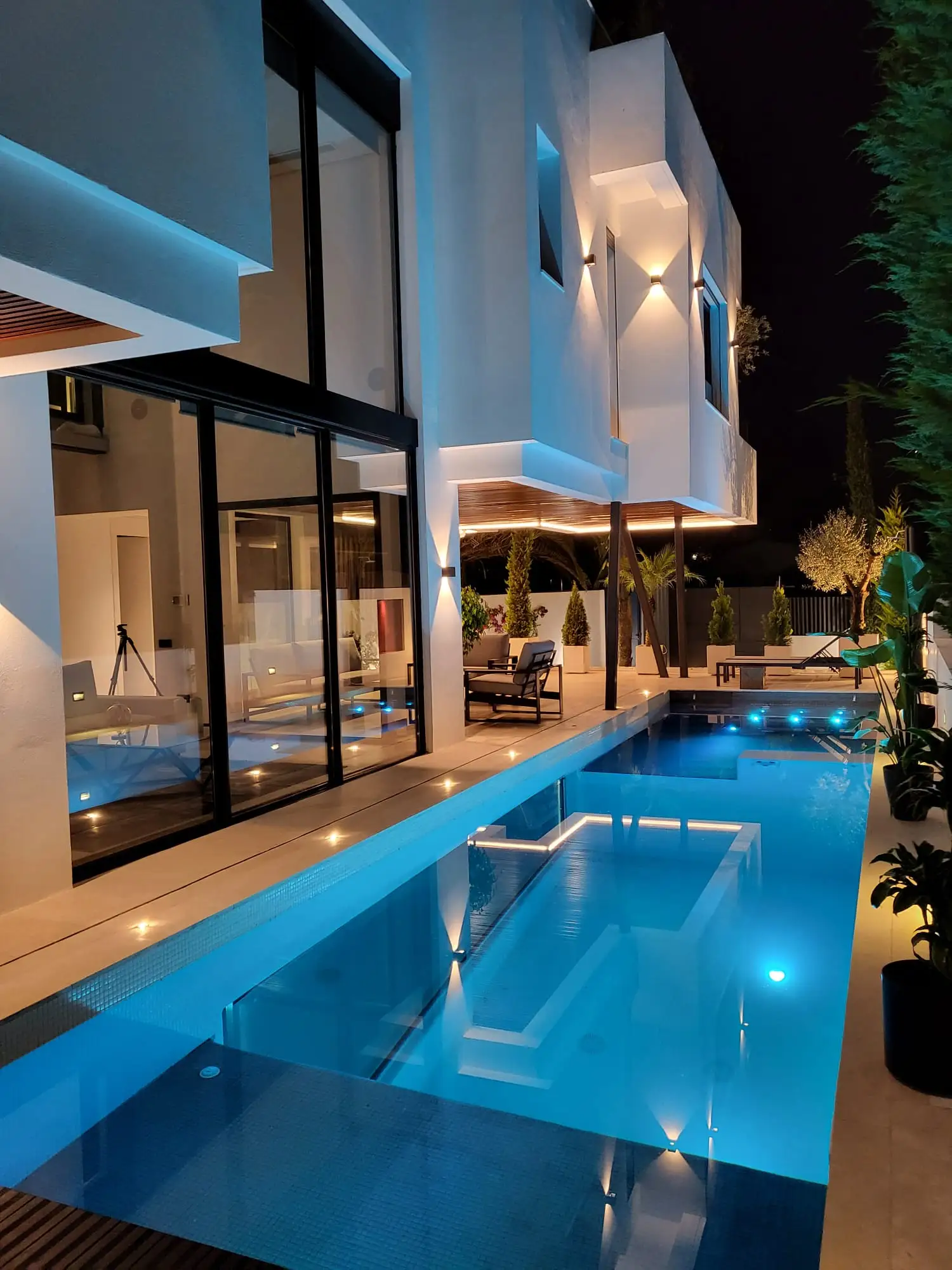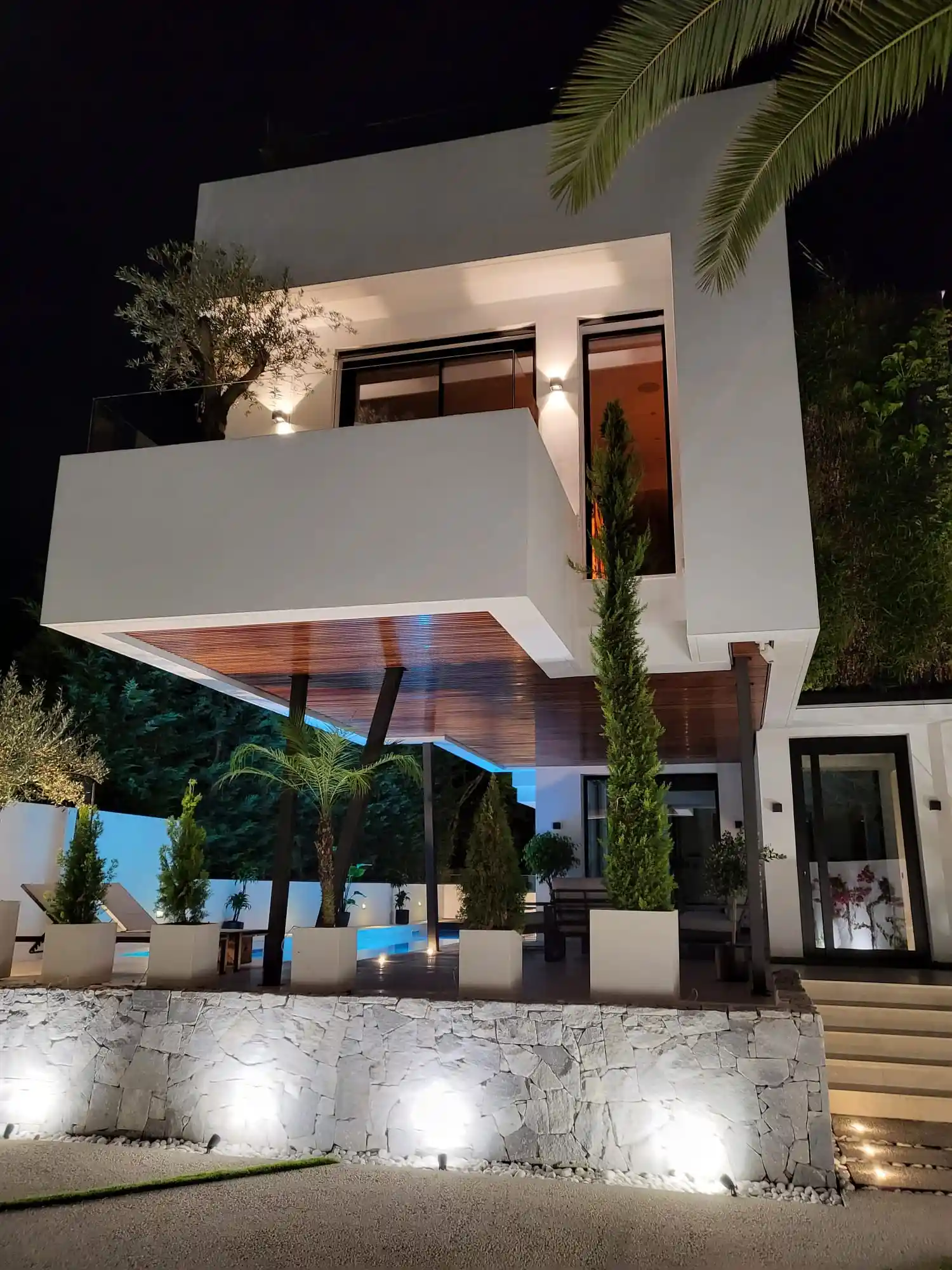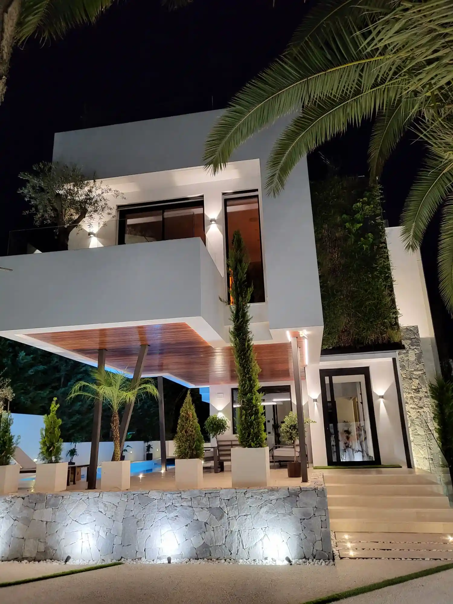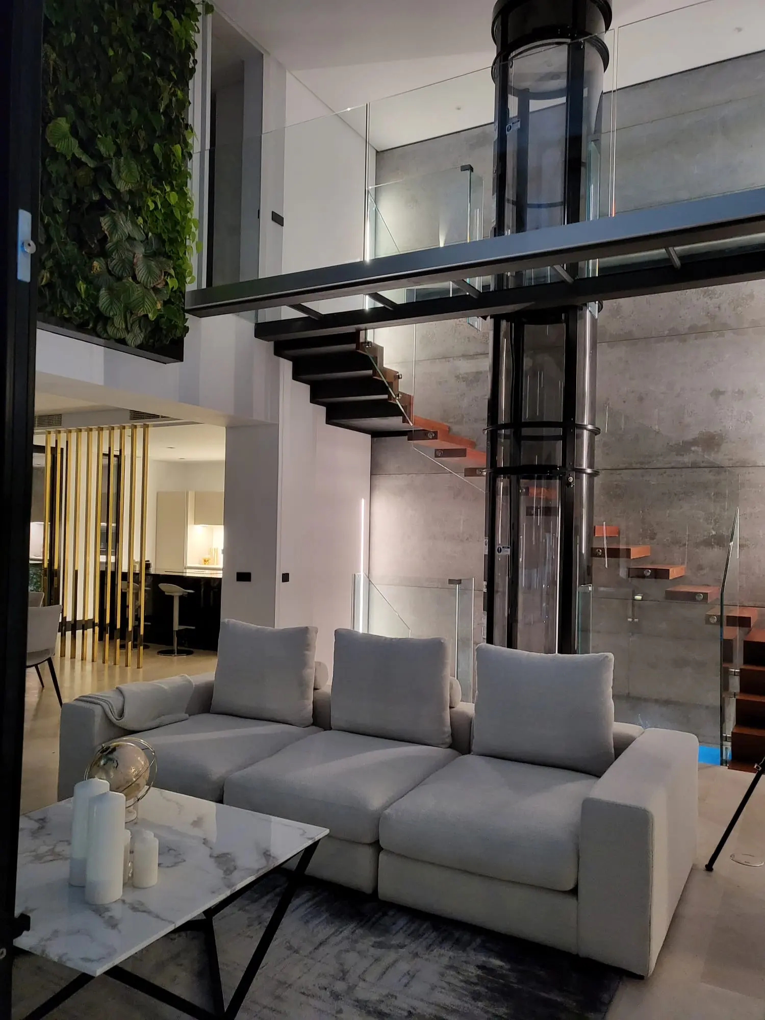 Set on a 503 m² plot with 836 m² distributed across three levels, the residence showcases a striking façade combining concrete, wood, stone and glass, enhanced by vertical gardens with automated irrigation. Inside, the home features a dramatic three-story concrete wall, a double-height living area and a Bulthaup kitchen equipped with Gaggenau appliances.